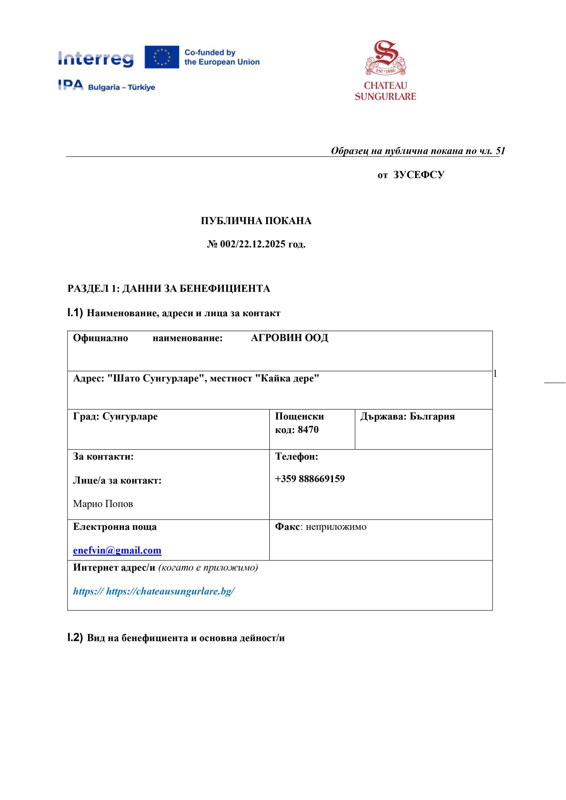 Фирма Агровин ООД, гр. Сунгурларе, съгласно изискванията на чл.4, ал.2